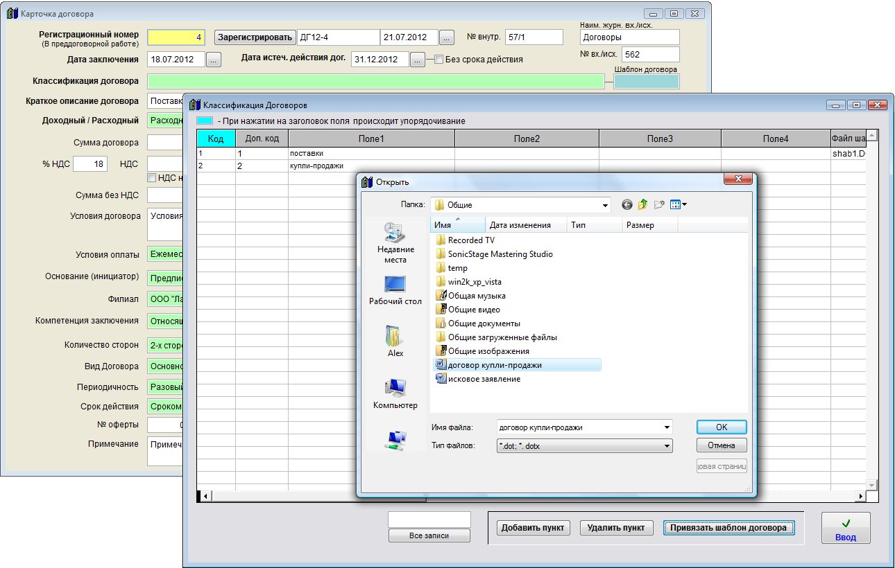 Нажмите кнопку "Привязать шаблон договора", затем через обзор файлов найдите сохраненный ранее файл шаблона и нажмите ОК.