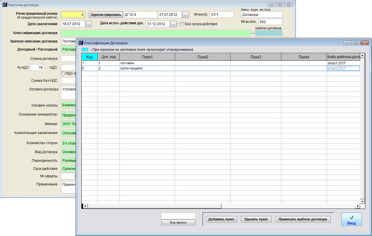 Выберите нужную классификацию в справочнике классификаций договоров и нажмите "Ввод", поле Шаблон договора в карточке договора заполнится автоматически в соответствии с выбранной классификацией договора.