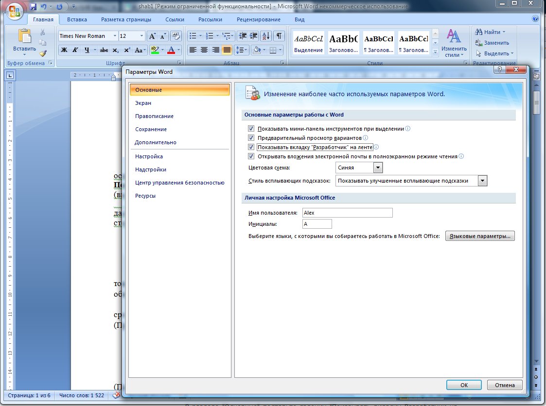 В разделе "Основные" поставьте галочку "Показывать вкладку Разработчик на ленте", затем нажмите ОК.
