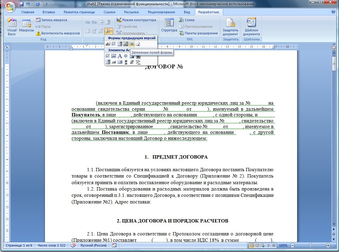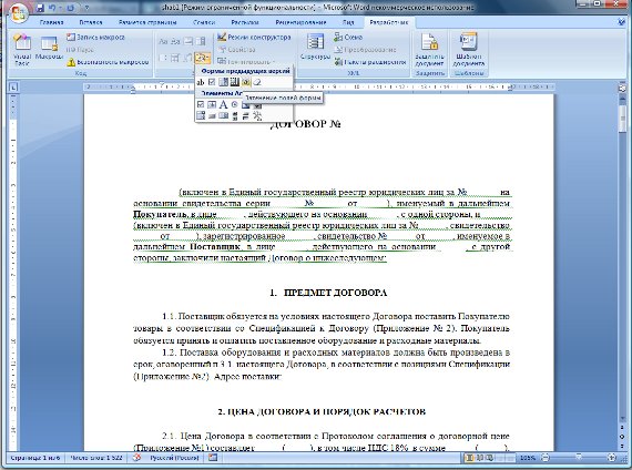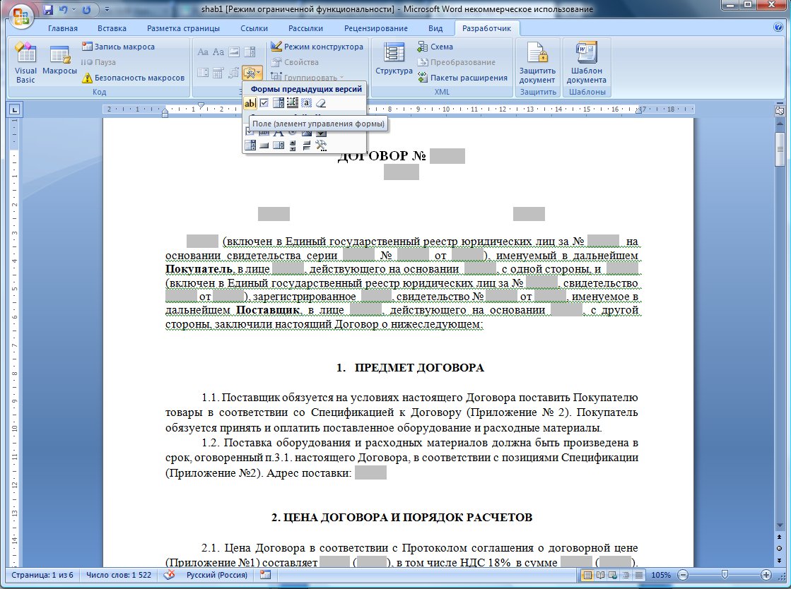 Сначала создаем шаблон договора. Пишем стандартный текст, в местах где надо будет вставлять свою информацию вставляем поля ввода. Делается это следующим образом: