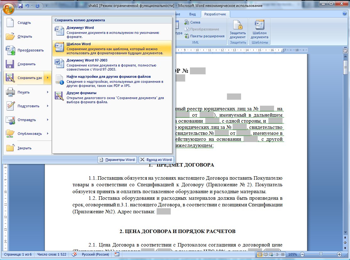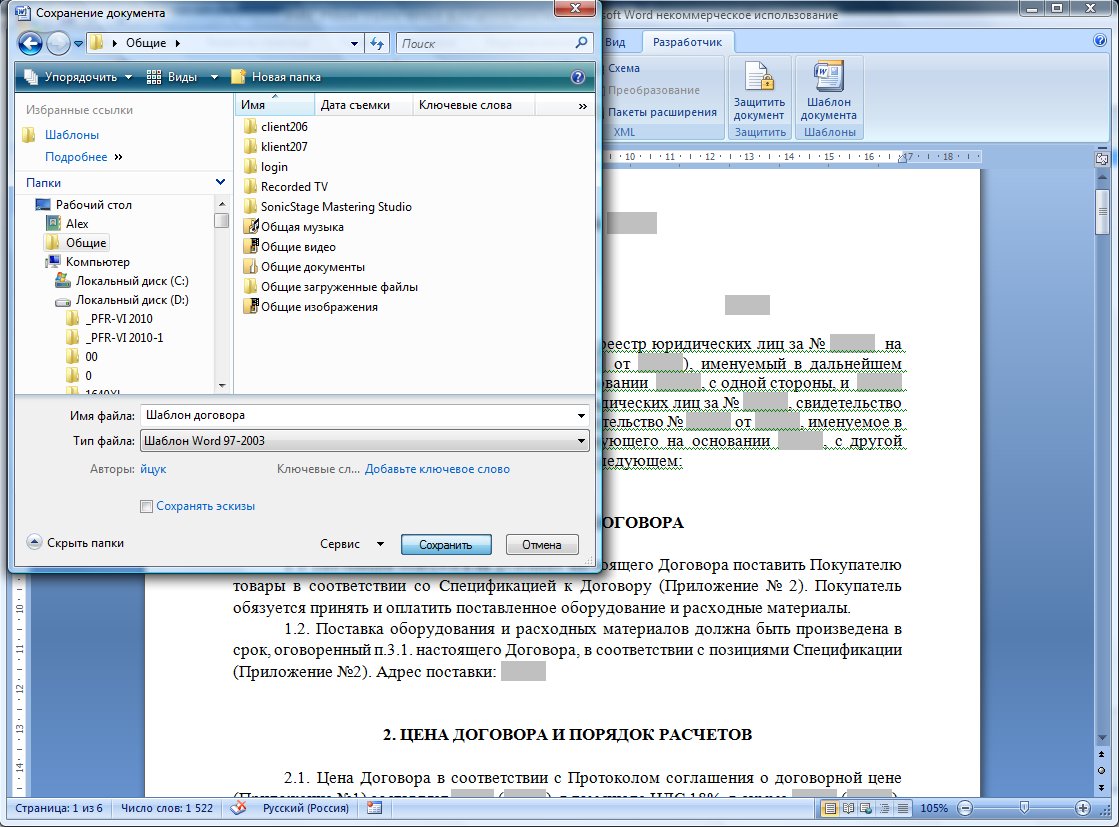 Отредактируйте шаблон договора как Вам требуется, после чего сохраните измененный шаблон в любое место на диске (например в папку "Мои документы") как шаблон.