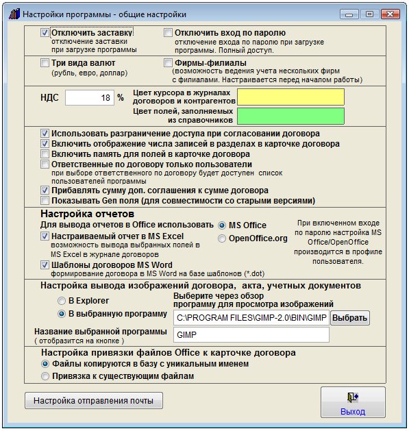Для настройки места хранения файлов Word и Excel из раздела Файлы Office в карточках договоров выберите пункт меню "Сервис - Общие настройки программы".