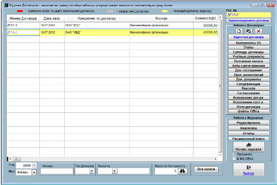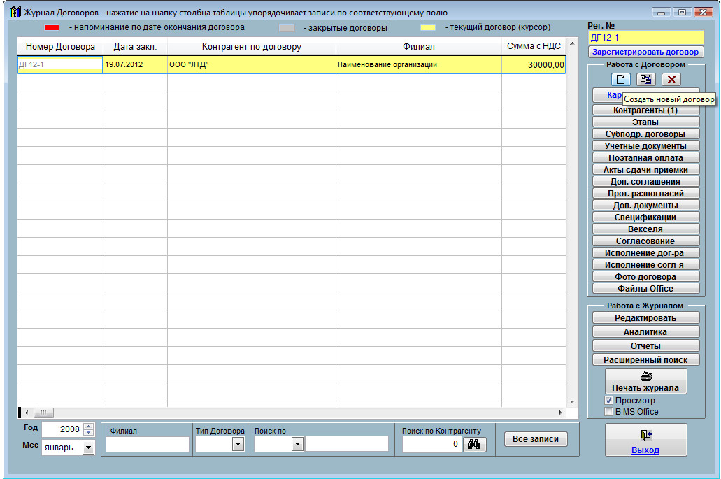Для добавления нового договора в журнал нажмите кнопку "Создать новый договор" с изображением чистого листка в правом верхнем углу формы журнала договоров.