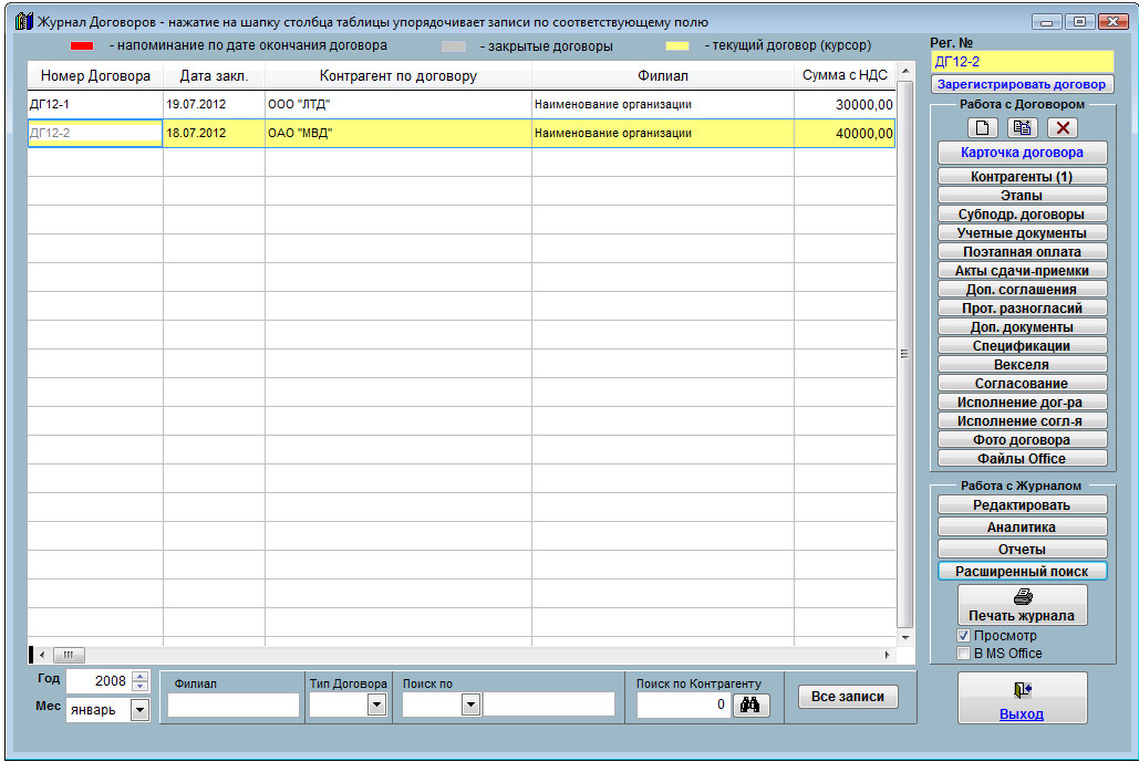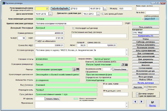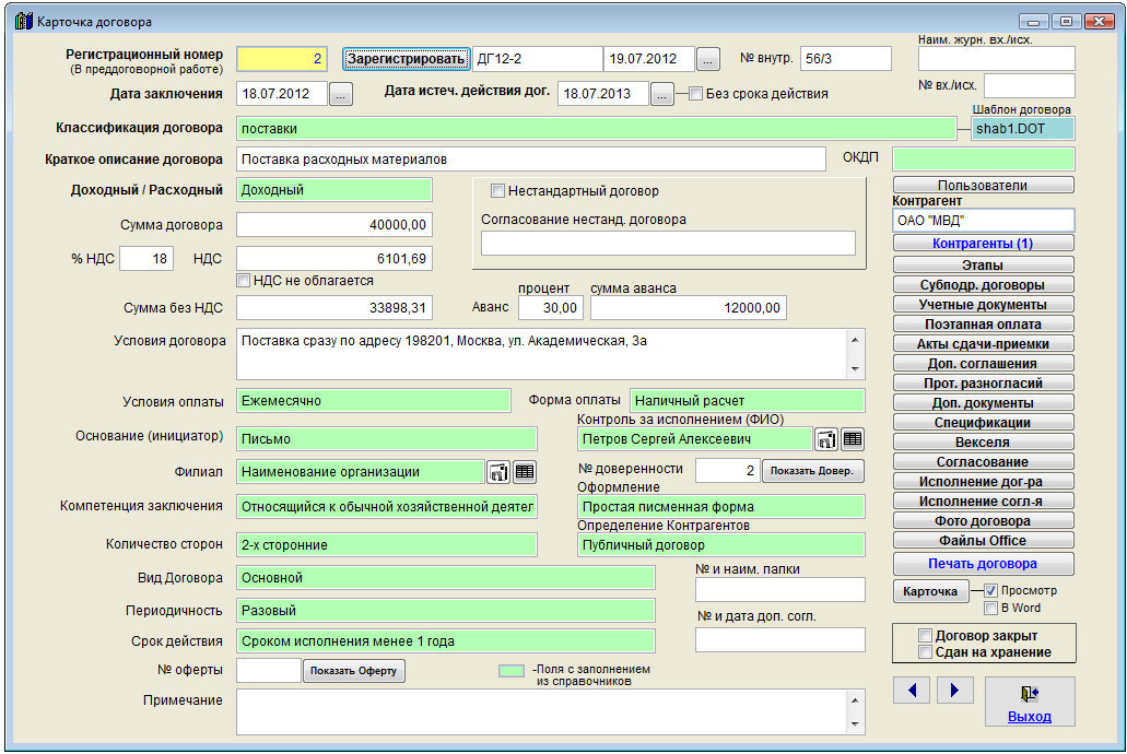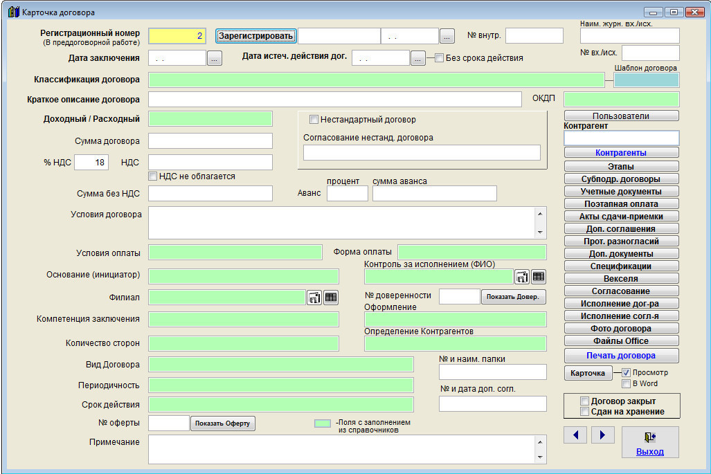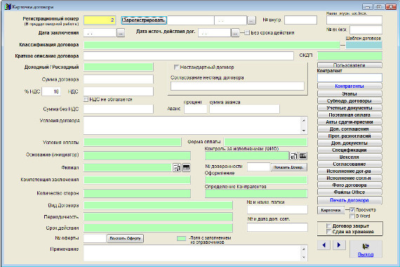 После заполнения карточки для перехода обратно в журнал договоров нажмите кнопку "Выход".