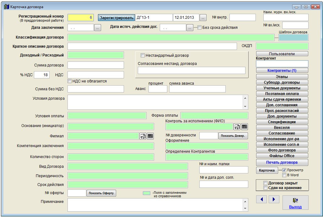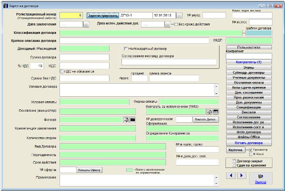 В результате при нажатии на кнопку Зарегистрировать в карточке договора номера начнут формироваться с единицы с новыми префиксами.