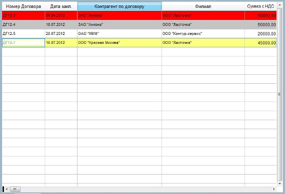 Для упорядочивания таблицы договоров по нужному столбцу нажмите мышью по шапке того столбца, по которому требуется упорядочить журнал договоров.