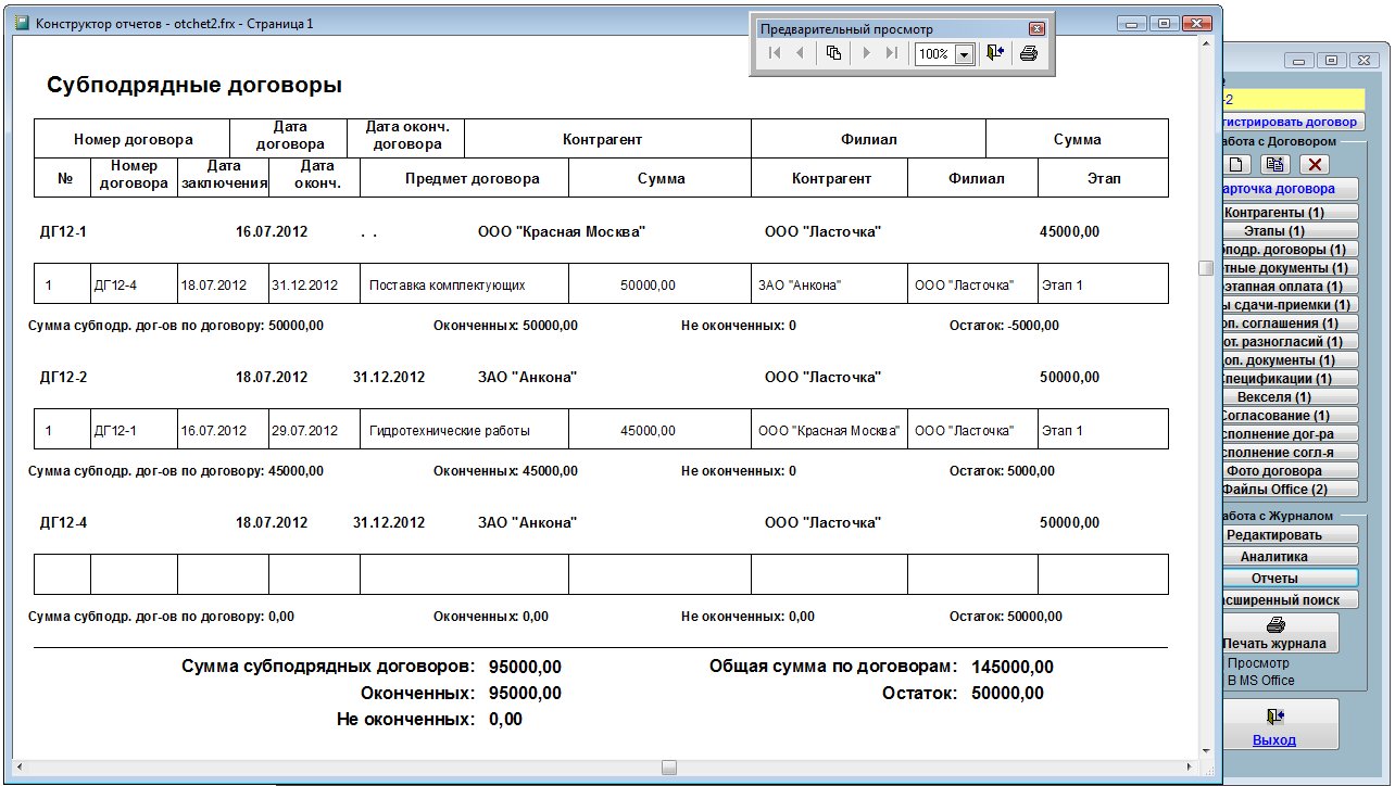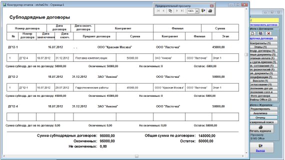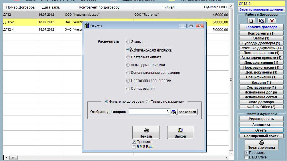 Для печати отчетов по договорам нажмите кнопку "Отчеты" в правой нижней части формы журнала договоров в группе кнопок "Работа с журналом".
