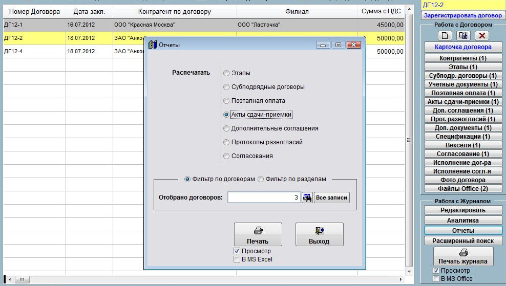 Для печати отчетов по договорам нажмите кнопку "Отчеты" в правой нижней части формы журнала договоров в группе кнопок "Работа с журналом".