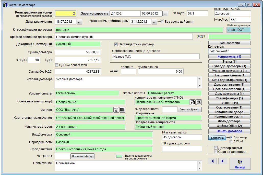 Для вывода карточки договора в установленный Microsoft Word либо, при соответствующей