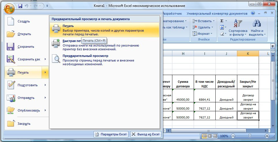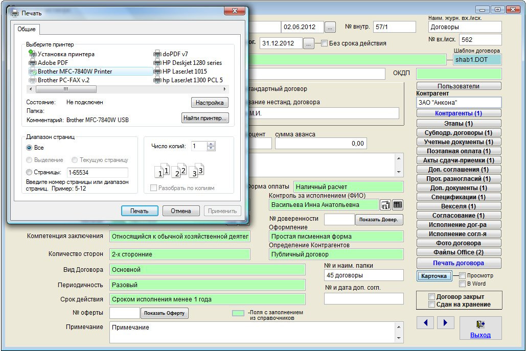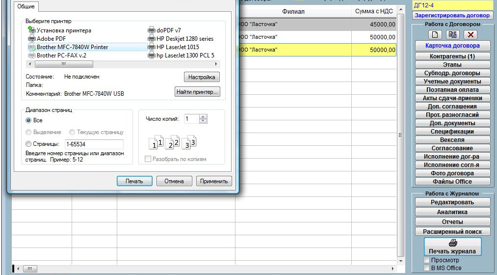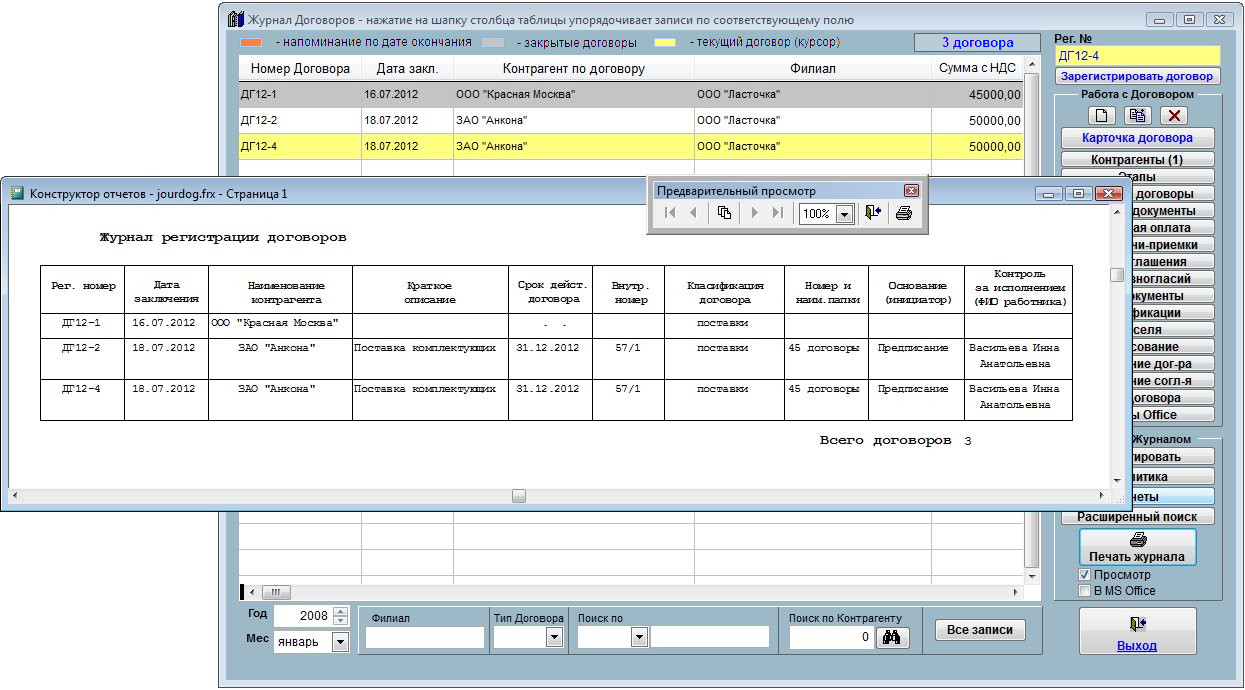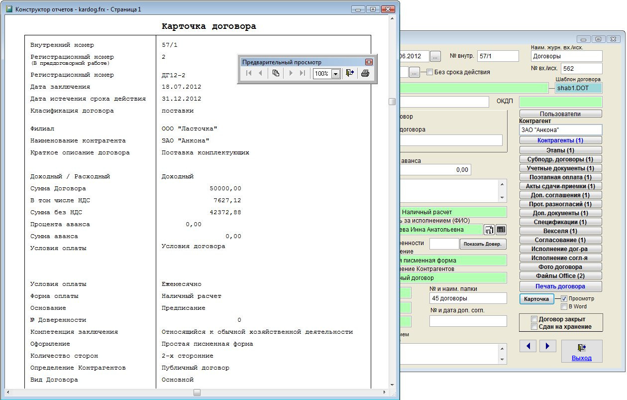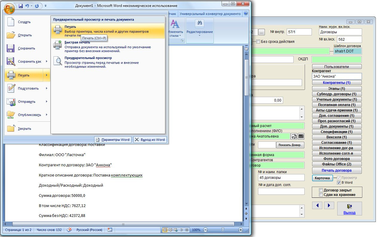 Как вывести на печать или в MS Word (OpenOffice Writer) карточку отдельного договора и журнал договоров