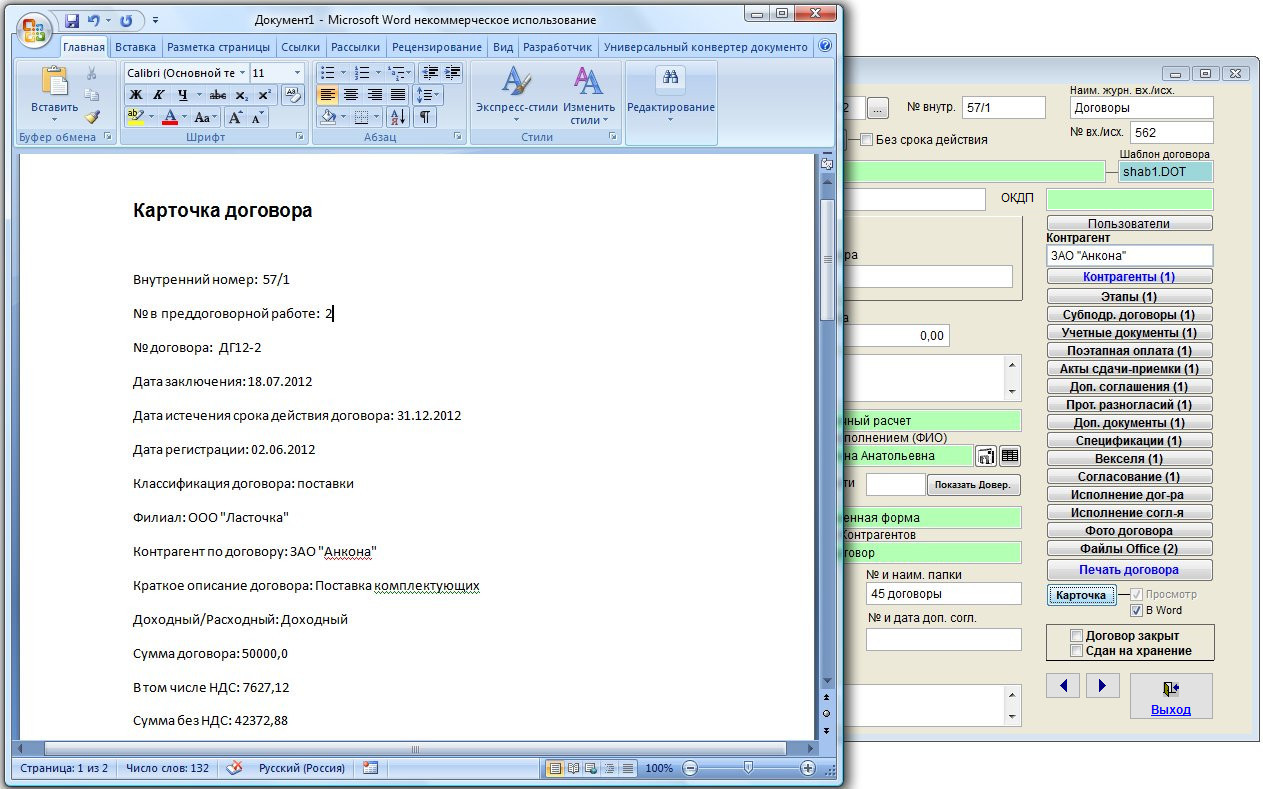 Карточка договора будет сформирована в MS Word либо, при соответствующей