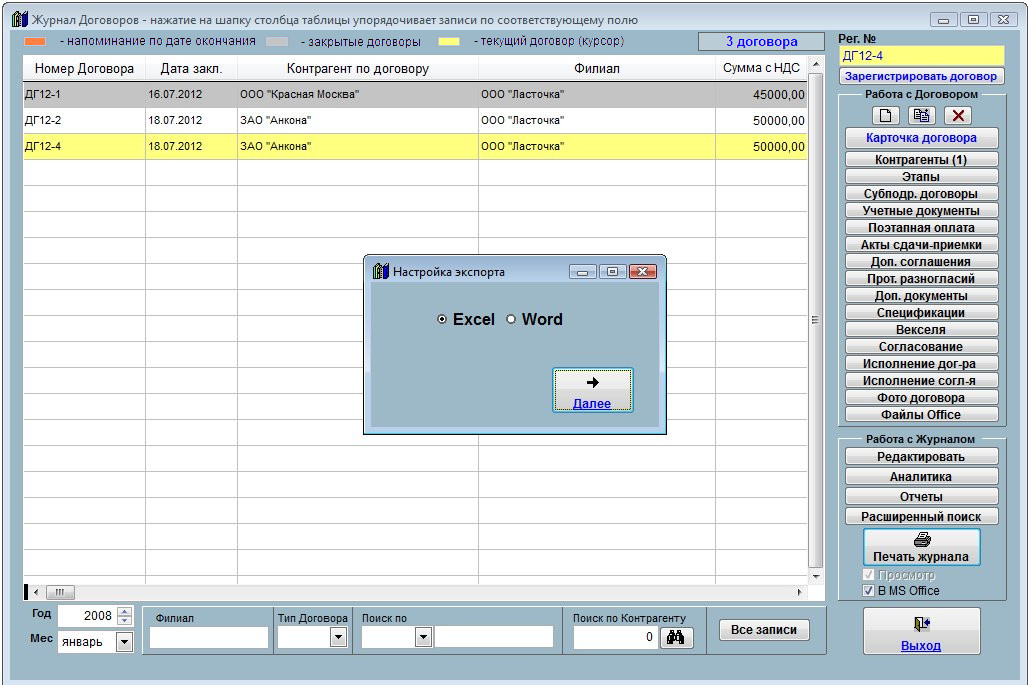 Для вывода журнала договоров в установленный Microsoft Excel (Word) либо, при соответствующей