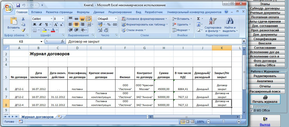 Журнал договоров будет сформирован в MS Excel (Word) либо, при соответствующей