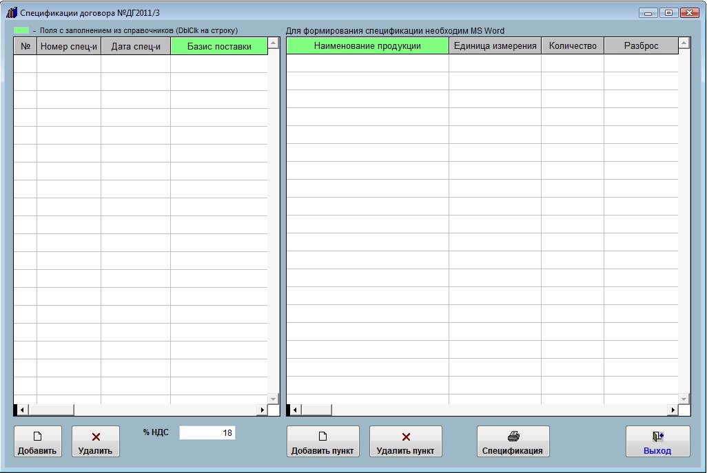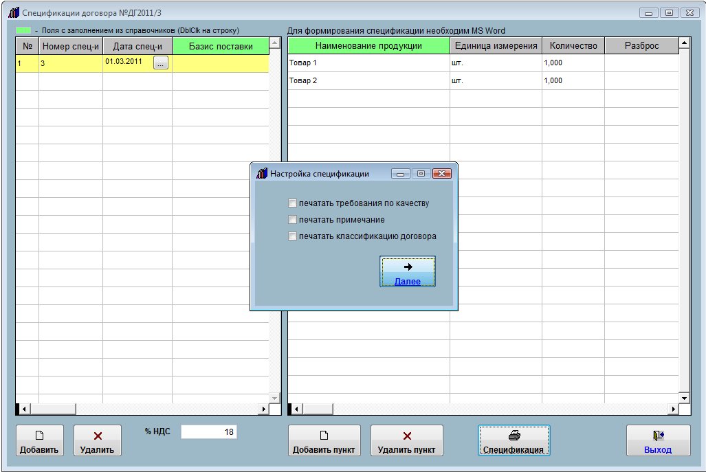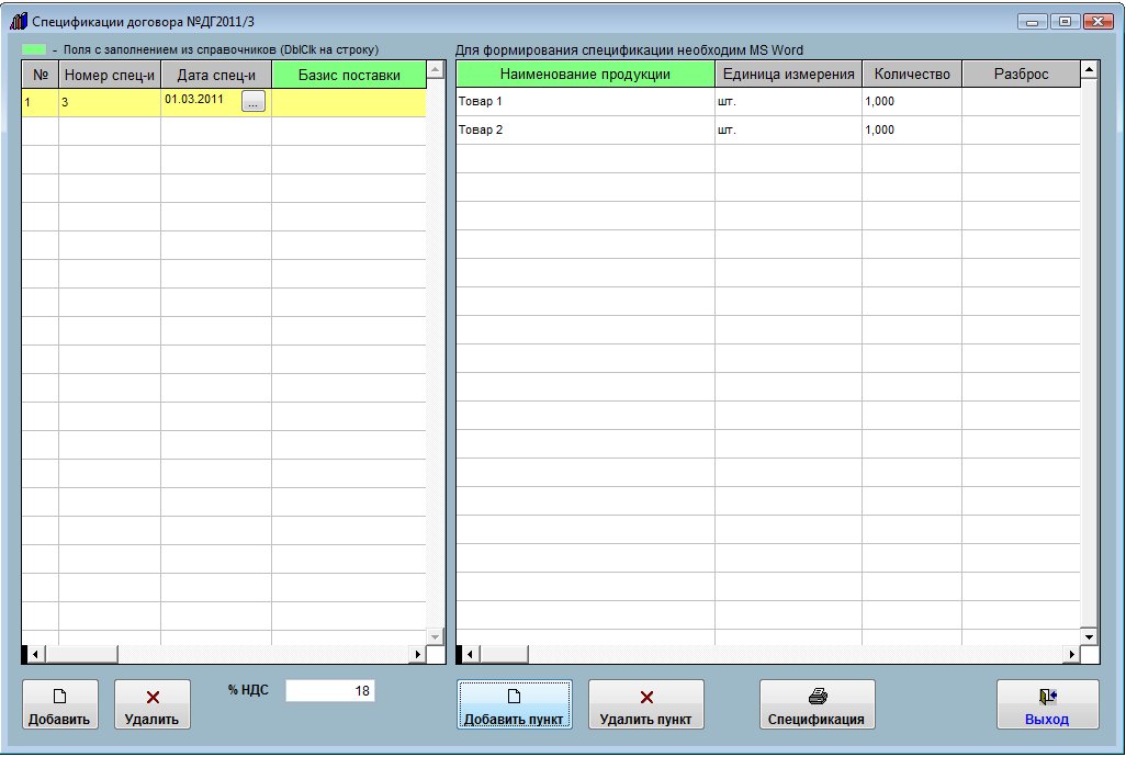 Затем с помощью кнопки "Добавить пункт" добавьте товарные позиции для выбранной спецификации, поле товар заполните из справочника (двойной щелчек мышью по полю "Наименование продукции"), сумма НДС и итоговая сумма посчитаются автоматически.