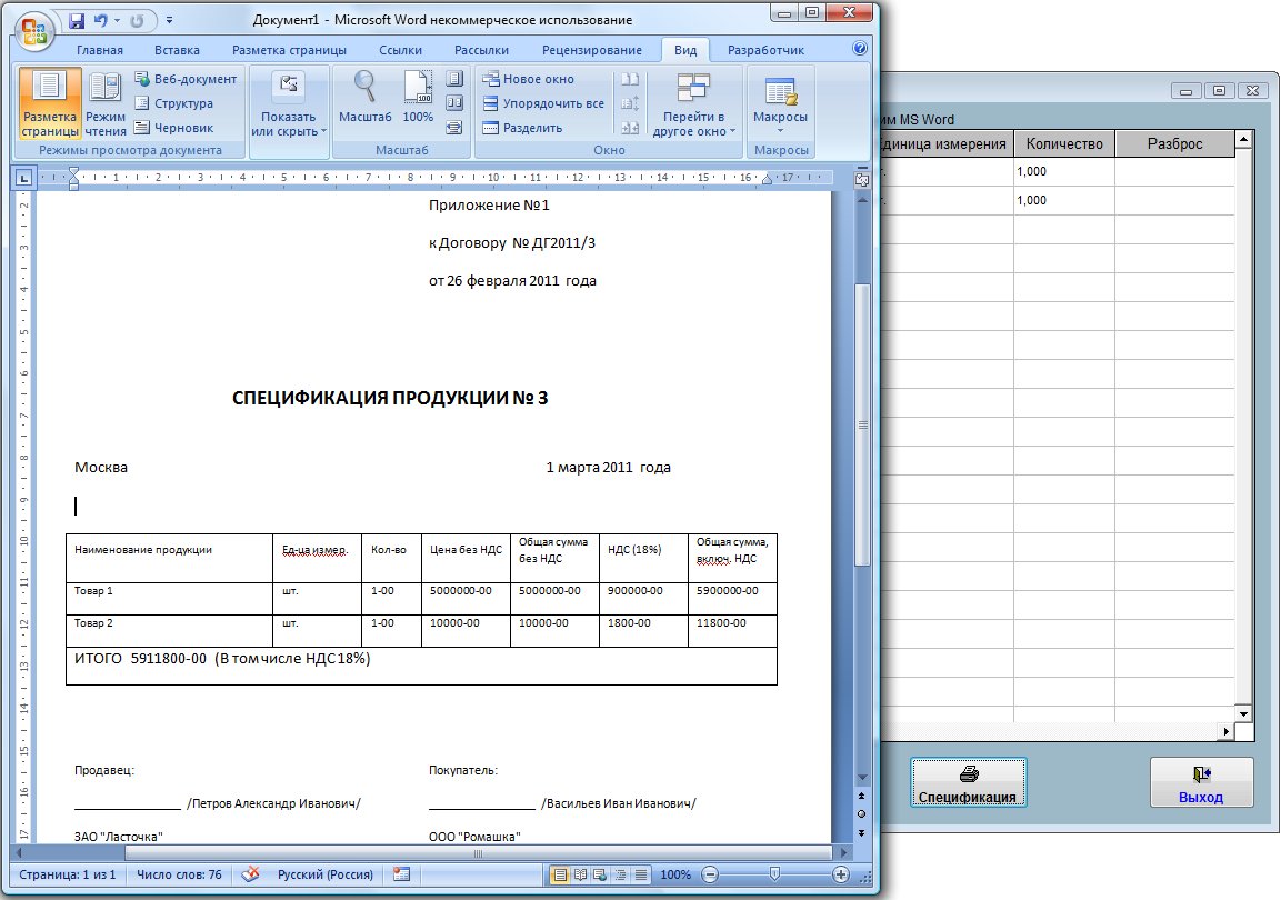 Спецификация будет сформирована в MS Word (либо, при соответствующей