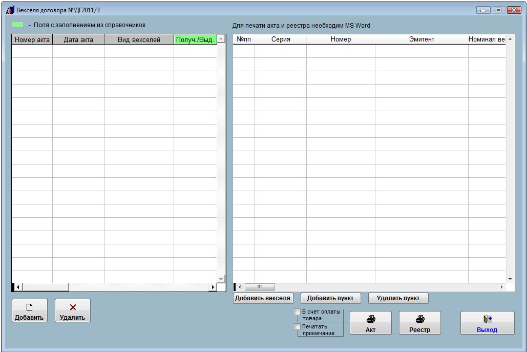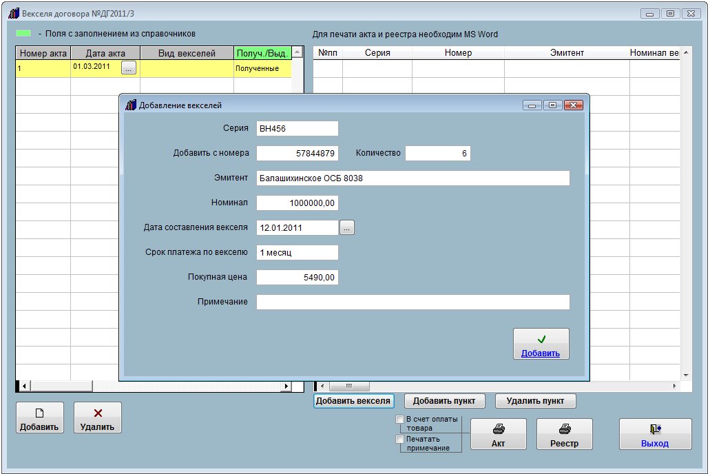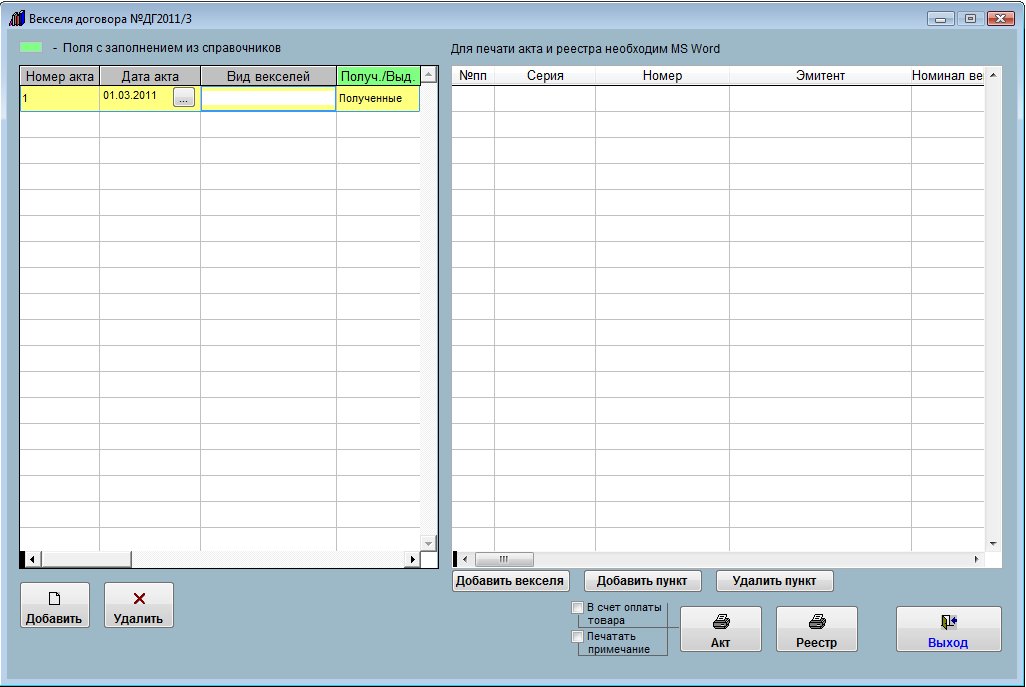 С помощью кнопки "Добавить пункт" можно добавить одиночный вексель.