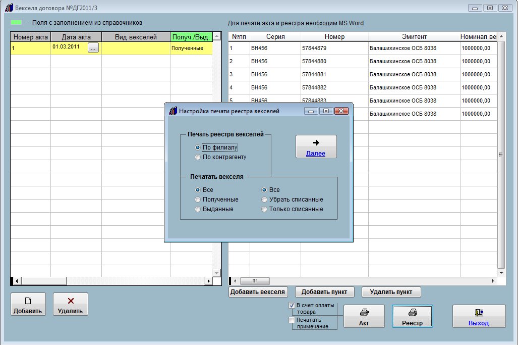 Акт приема-передачи векселей будет сформирован в MS Word (либо, при соответствующей настройке, в OO Writer).