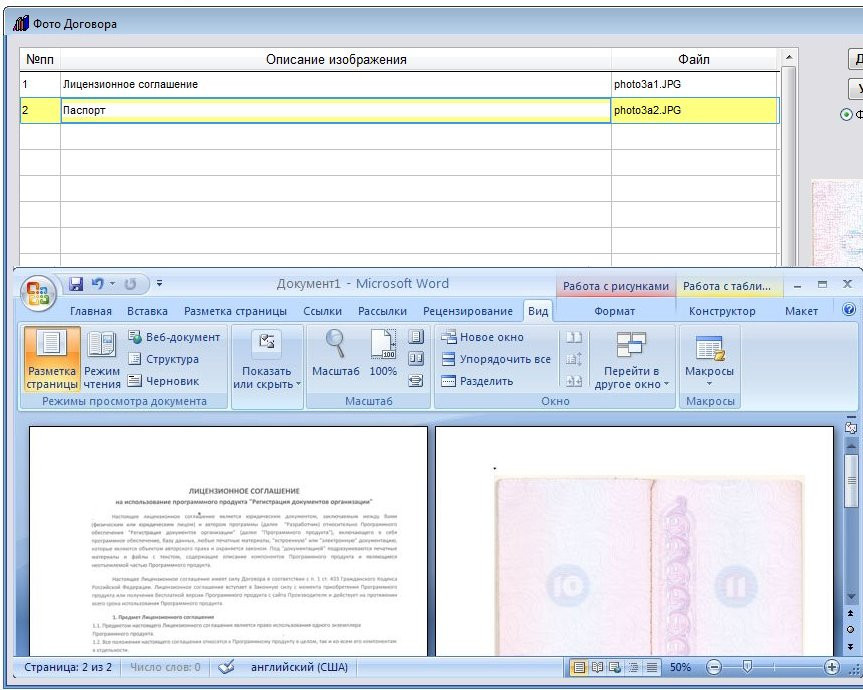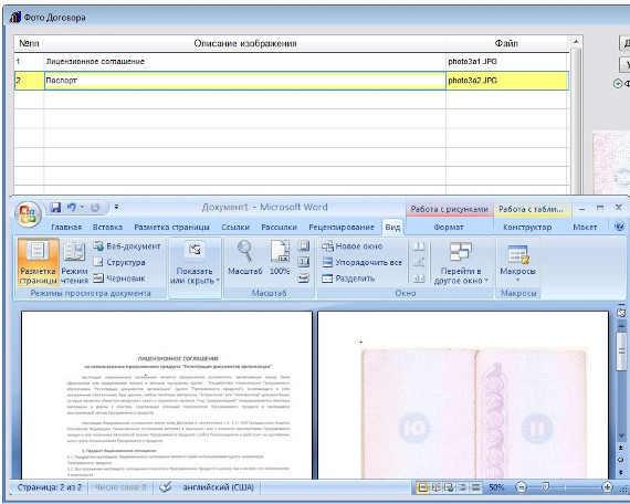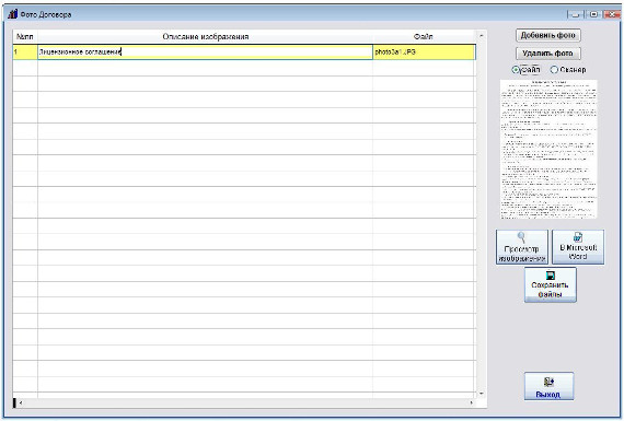 Для просмотра и вывода на печать отсканированных изображений документов в карточке договора нажмите кнопку "Фото договора".