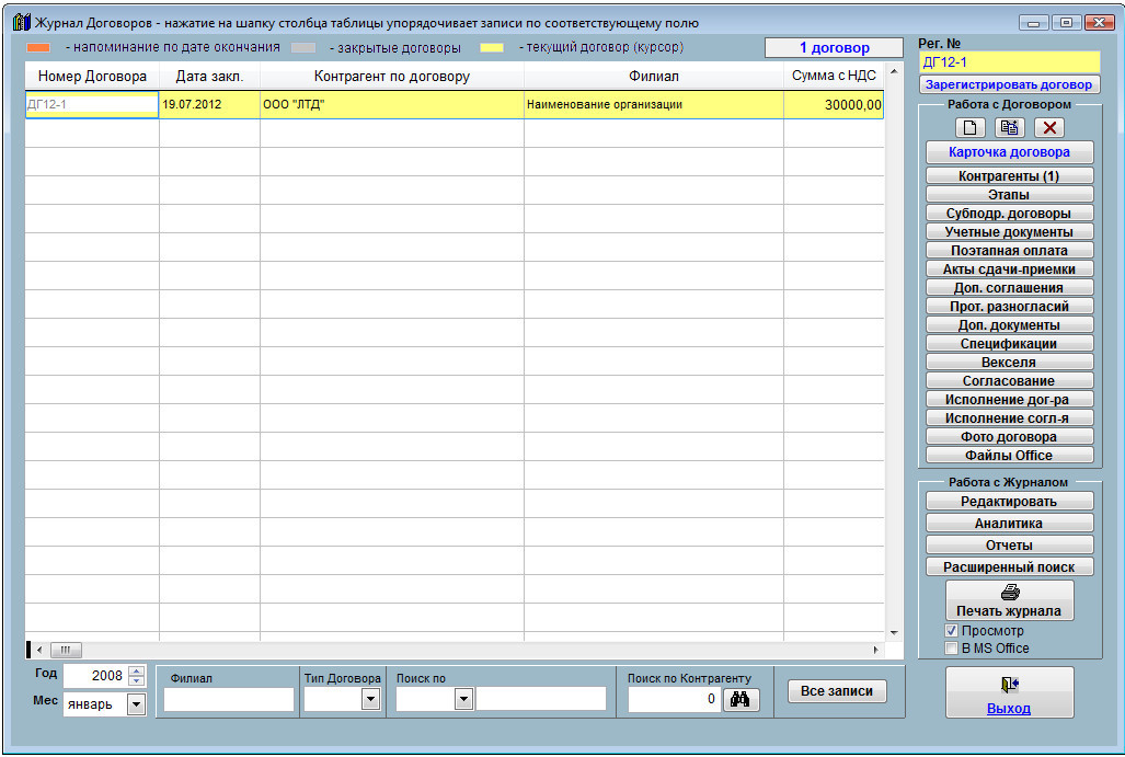 - Печать журнала договоров и карточки договора, вывод в MS Office, возможность настройки отчета в Excel.