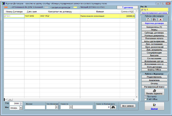 В программе ведется журнал договоров, на каждый договор составляется карточка договора.