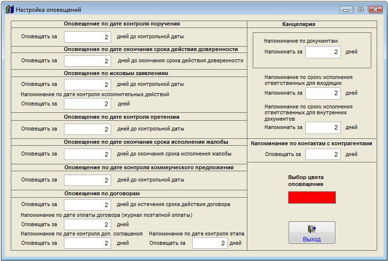 Для задания количества дней, за которое до текущей даты срабатывает оповещение по искам выберите пункт меню "Сервис-Настройка оповещений".