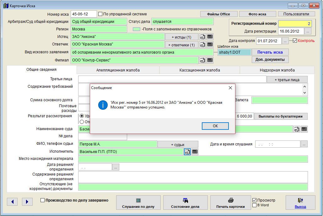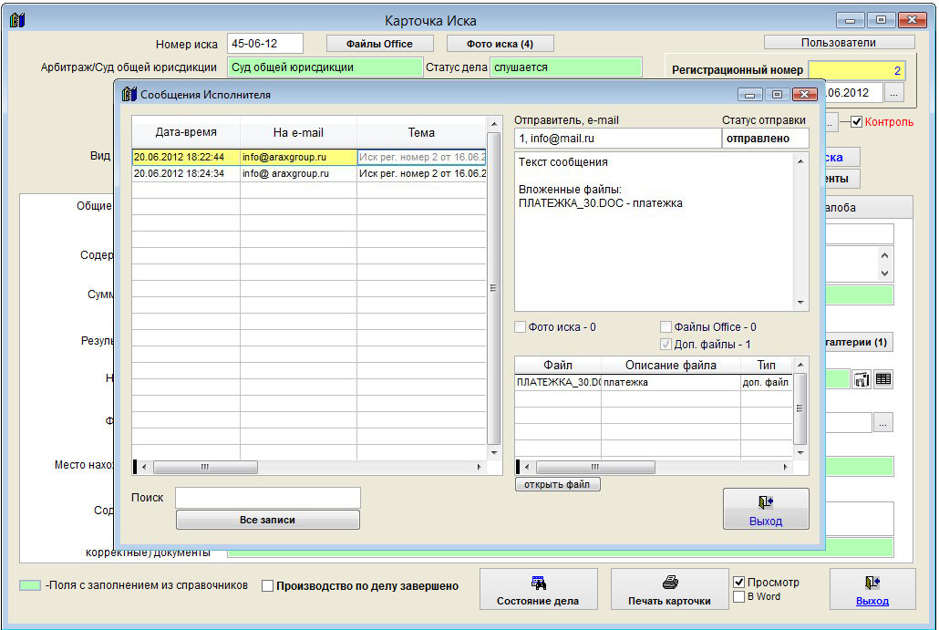Откроются сообщения, отправленные из программы данному лицу в связи с данным иском.