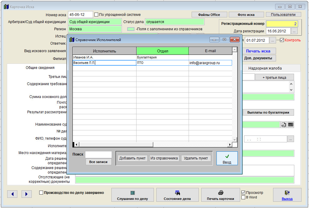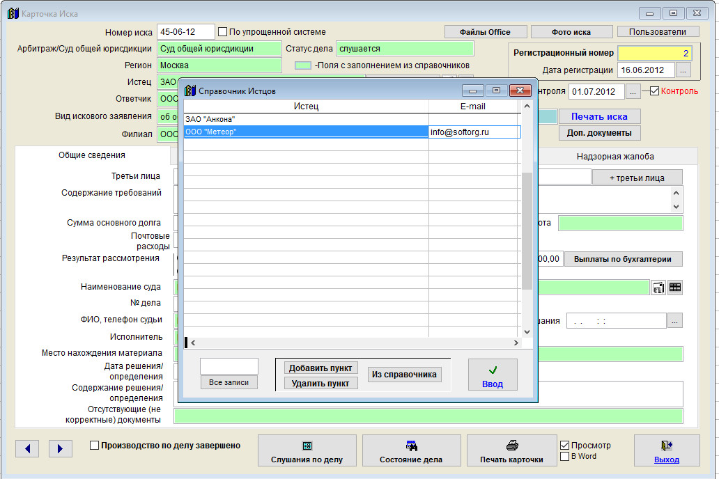 Электронные адреса Истцов вносятся в справочнике Истцов, электронные адреса Ответчиков вносятся в справочнике Ответчиков (справочники истцов и ответчиков могут заполняться из справочника контрагентов меню Сервис-Контрагенты, в этом случае e-mail должен быть заполнен в карточке контрагента).