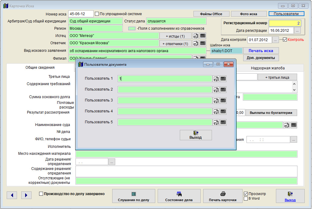 Для отправки уведомления по e-mail получателю иска, филиалу либо пользователю иска надо открыть соответствующий раздел - карточку иска, либо раздел Пользователи в карточке.
