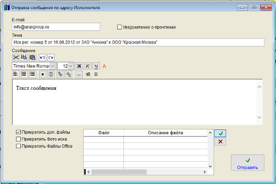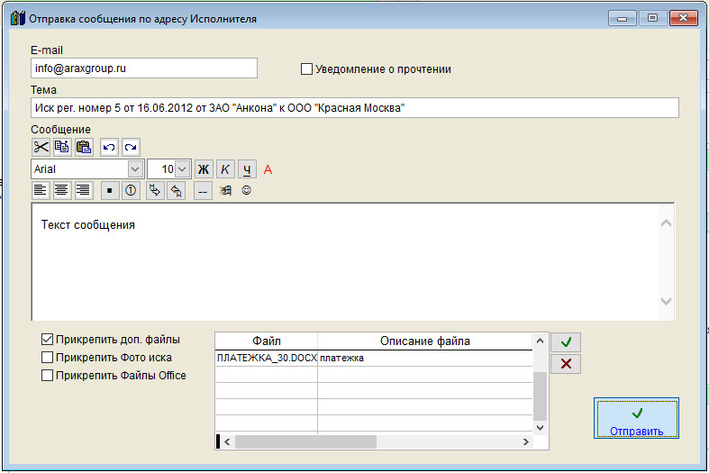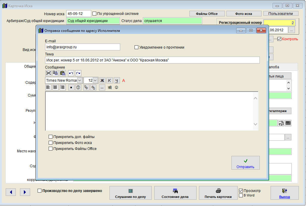 Если эти галочки установлены, то письму будут прикреплены все файлы из соответствующих разделов карточки иска.
