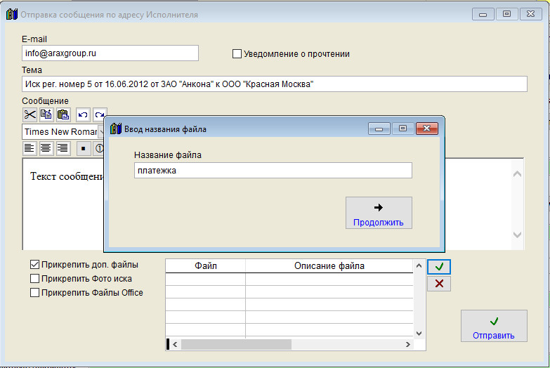 В окне "Ввод названия файла" введите имя прикрепляемого файла и нажмите кнопку "Продолжить".