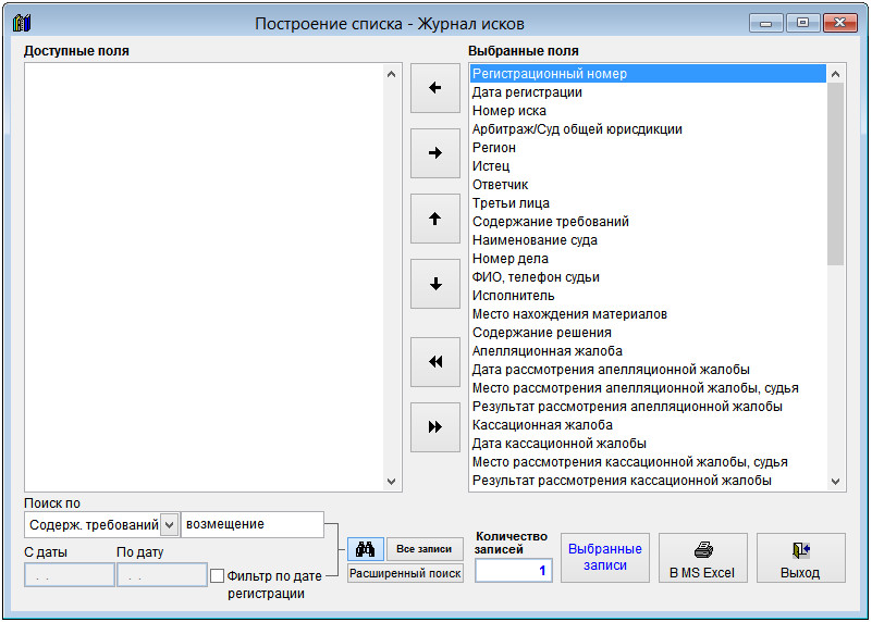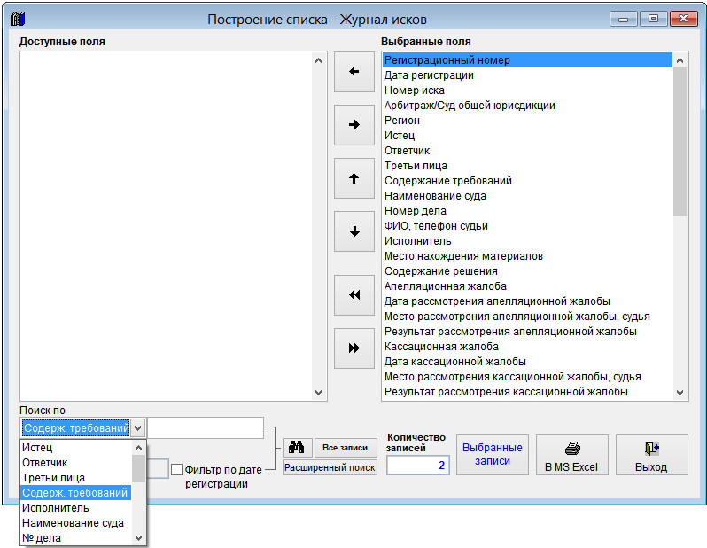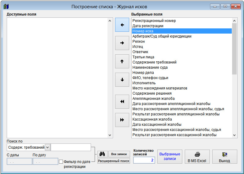 В окне настройки выберите те поля карточки иска, которые требуется экспортировать в MS Excel (OO Calc).