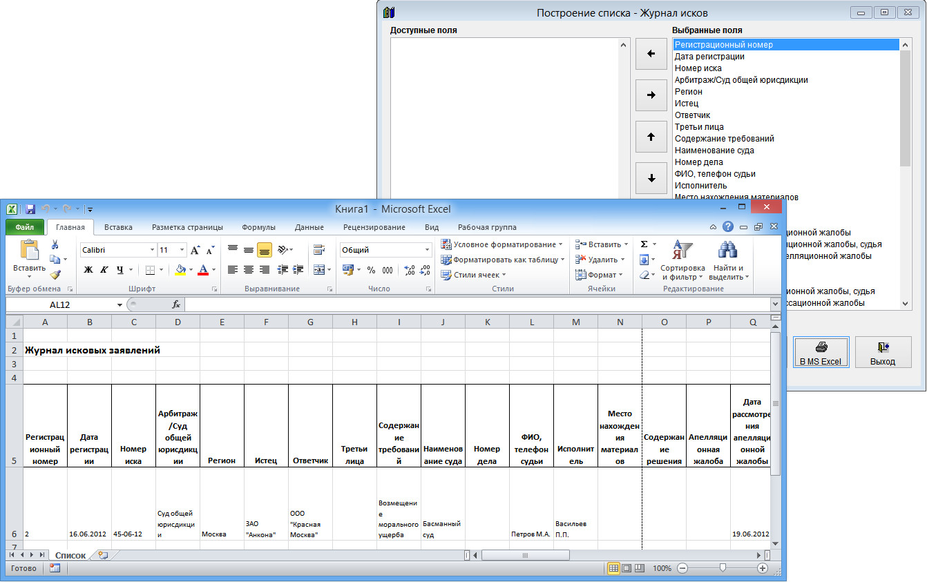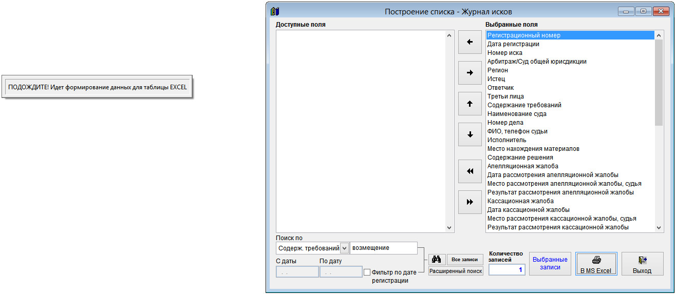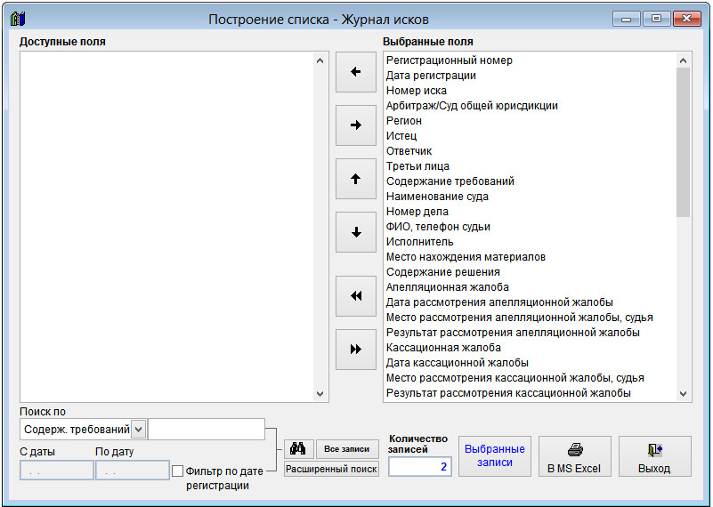 Для экспорта журнала исков в Microsoft Excel, либо, при соответствующей