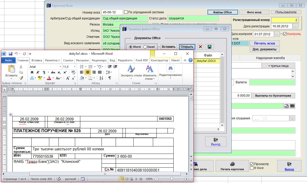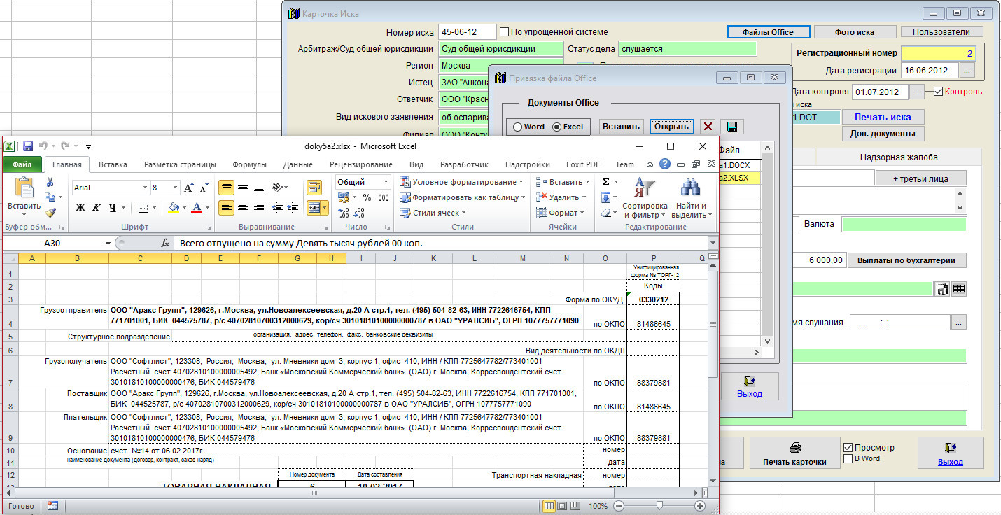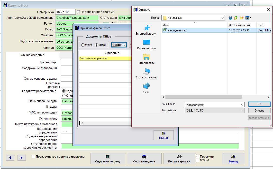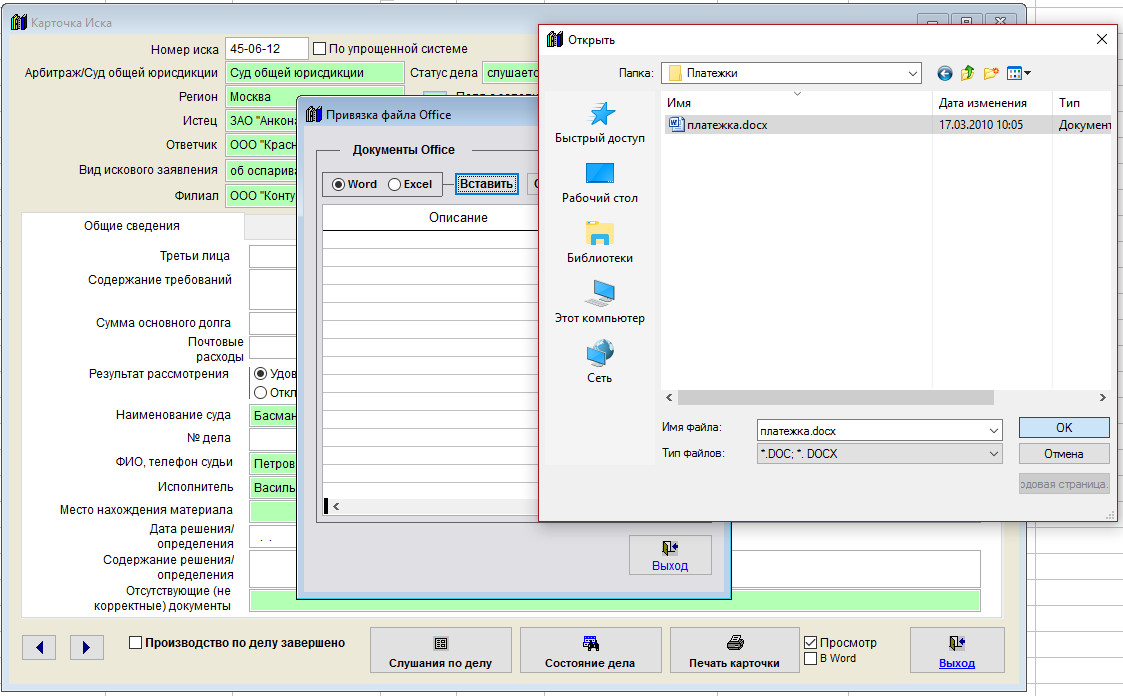 Для прикрепления файлов Word и Excel нажмите кнопку "Файлы Office" в карточке иска.
