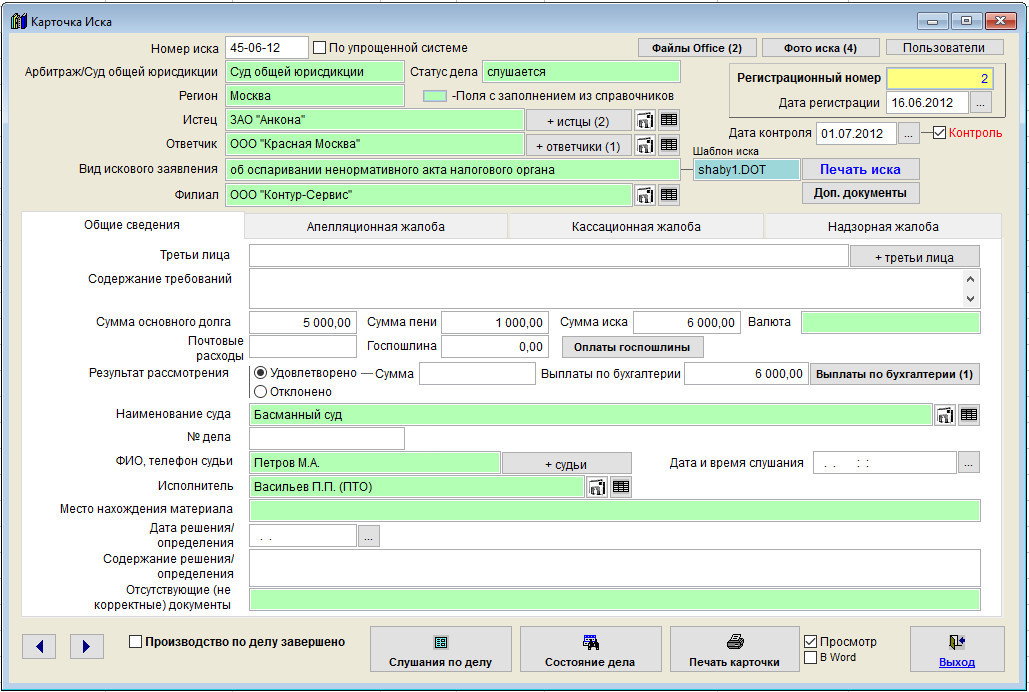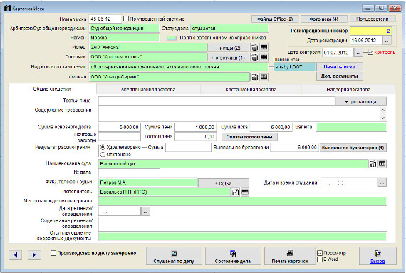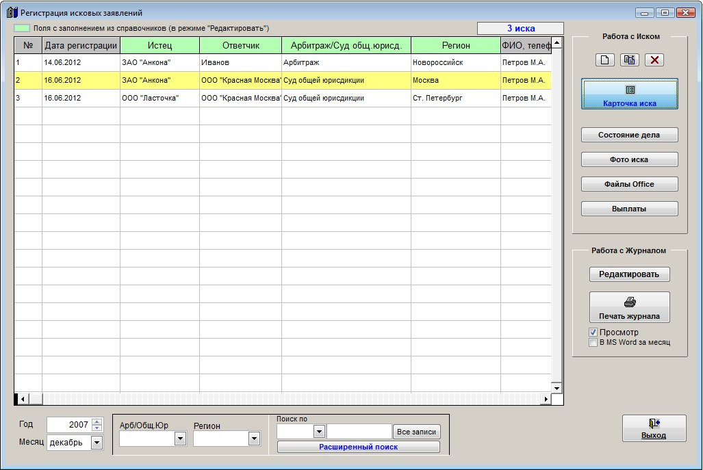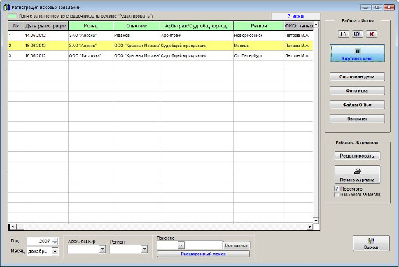 Для внесения изменений в зарегистрированный иск в журнале исков установите курсор на иск с нужным номером.