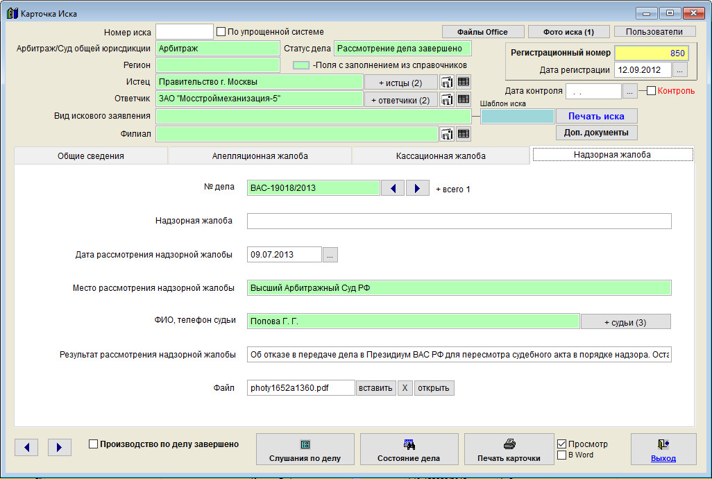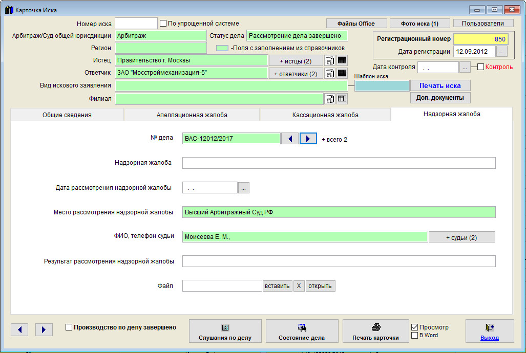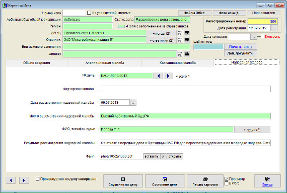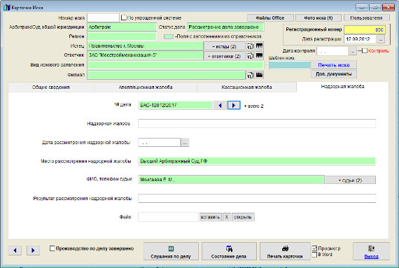 Чтобы учесть надзорную жалобу откройте карточку иска и мышкой перейдите в закладку "Надзорная жалоба".