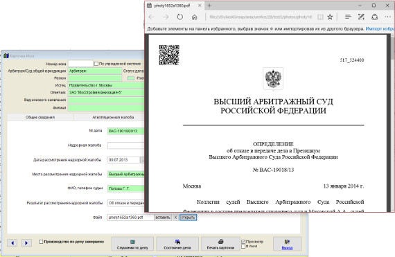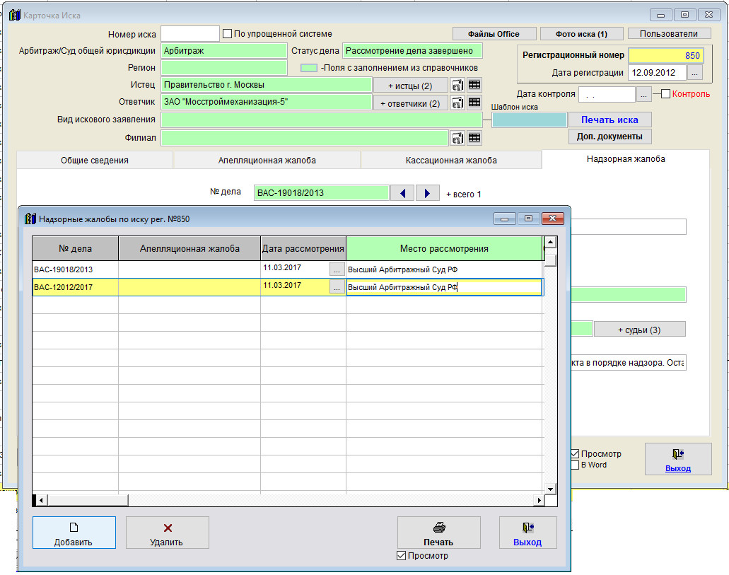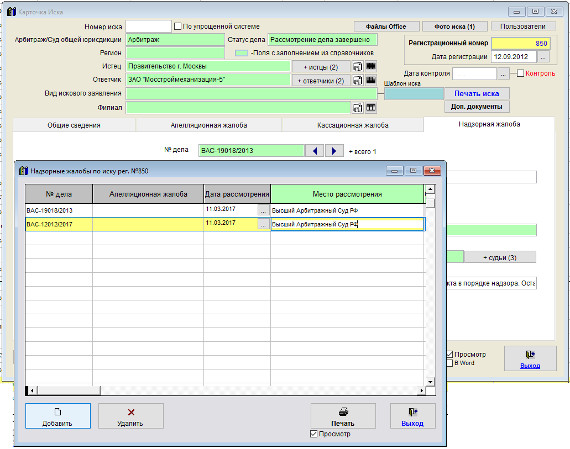 В случае, если надзорных жалоб несколько, щелкните дважды мышкой по полю "№ дела", откроется окно, в котором можно добавить любое количество надзорных жалоб по иску, распечатать отчет, прикрепить и посмотреть файлы.