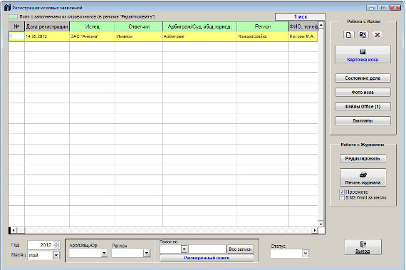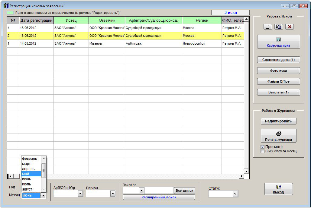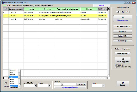В журнале исков отобразятся иски с датой иска за выбранный месяц выбранного года.