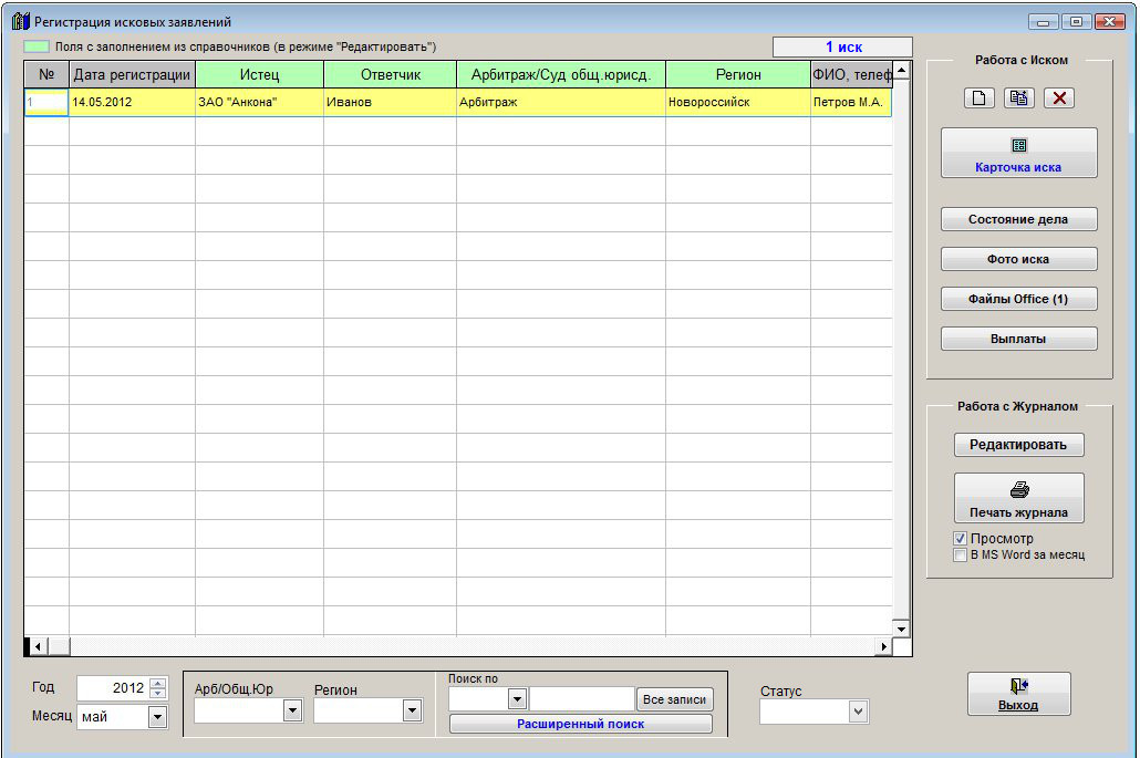 Для быстрого поиска исков по году и месяцу используйте группу Год-Месяц в журнале исков.