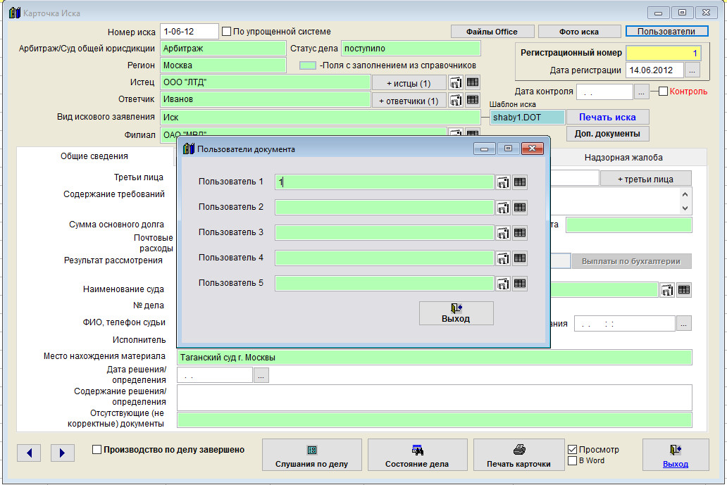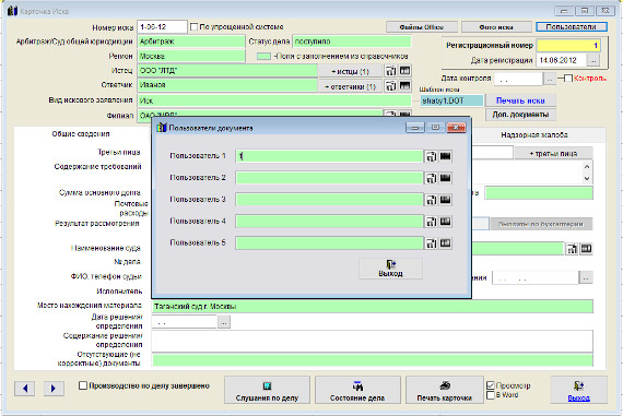 Для добавления/изменения пользователя в режиме Администратора нажмите кнопку "Пользователи" в карточке иска