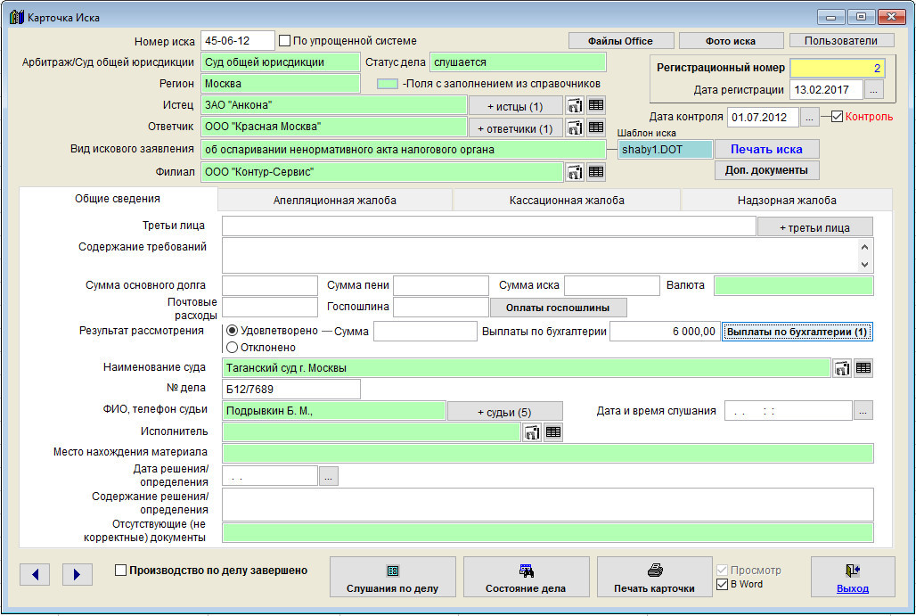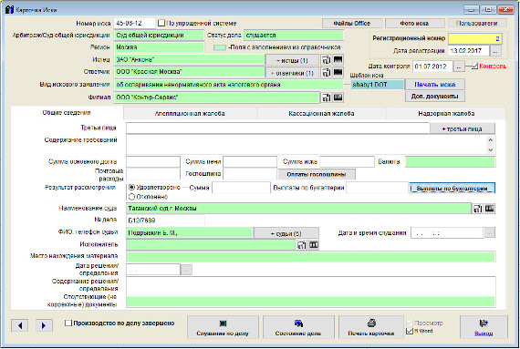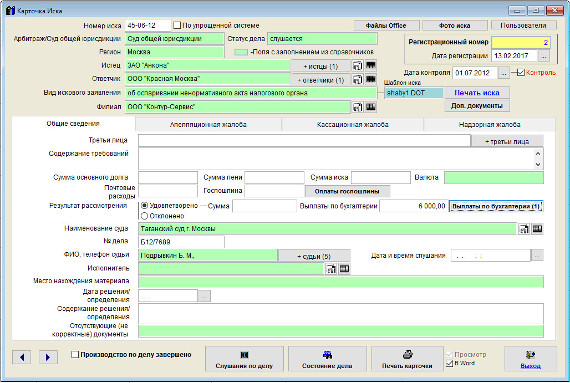 Общая сумма выплат по иску (для которых установлена галочка "Учитывать") отобразится в поле "Сумма выплат по бухгалтерии" в карточке иска.