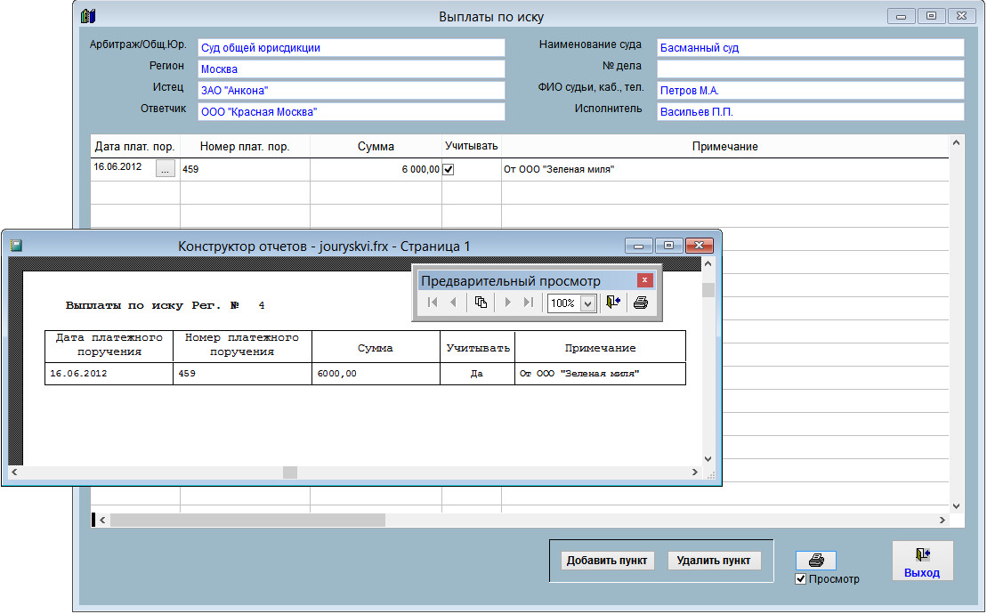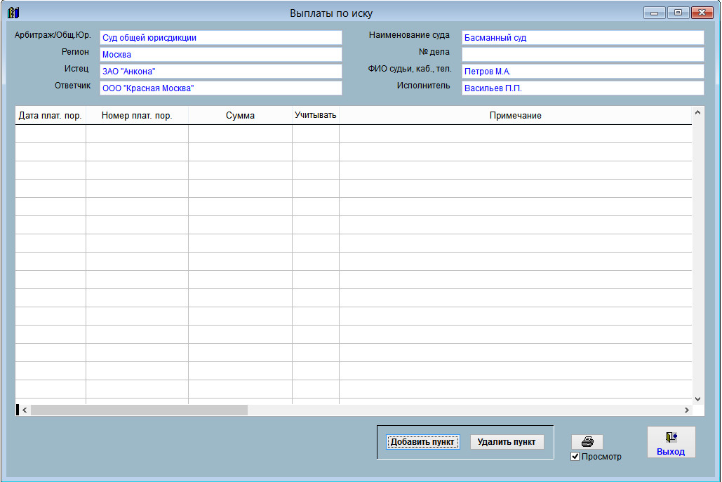 Откроется окно "Выплаты по иску".