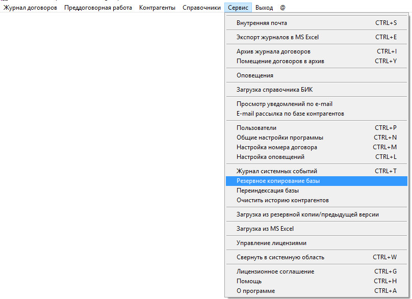 Для создания резервной копии через интерфейс программы "Ведение договоров" выберите раздел меню "Сервис-Резервное копирование базы".