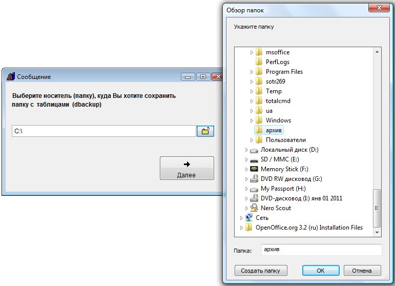 В открывшемся окне нажмите на кнопку с желтой папкой и выберите папку, в которую Вы хотите сохранить информацию, например C:\архив и нажмите кнопку "Далее".