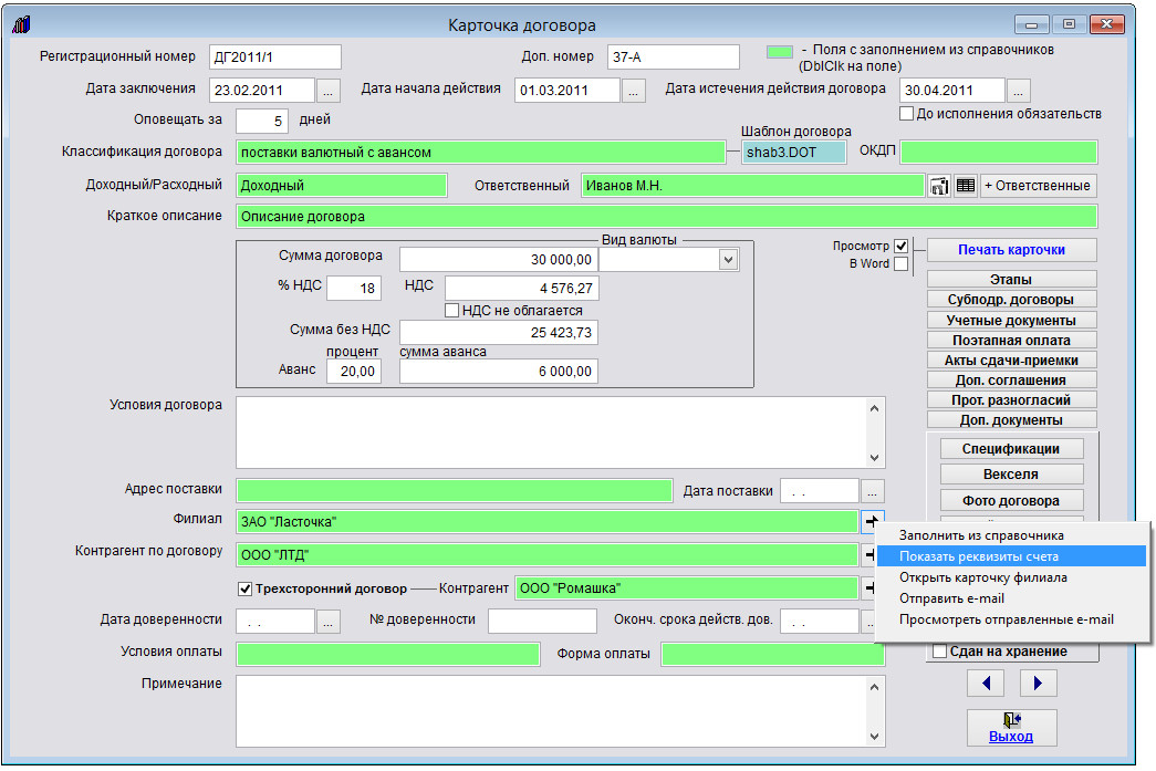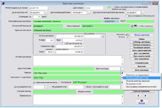 Реквизиты выбранного счета отобразятся в карточке договора.