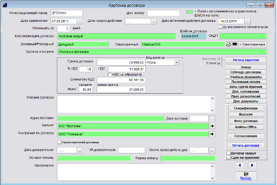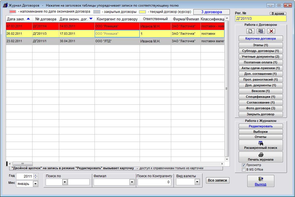 Также по данным договорам будет осуществляться цветовое оповещение в журнале договоров.