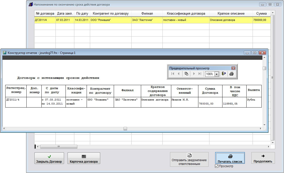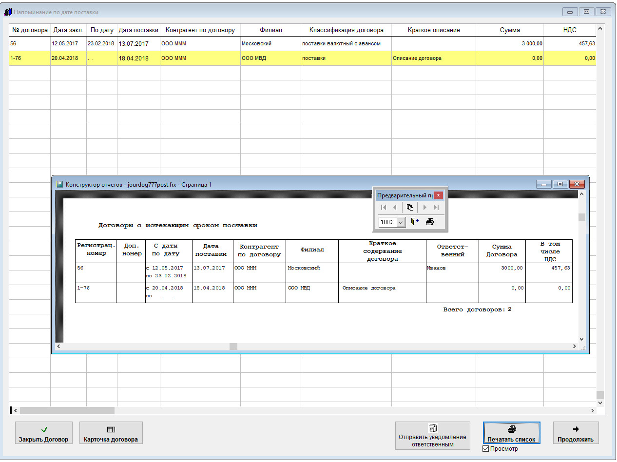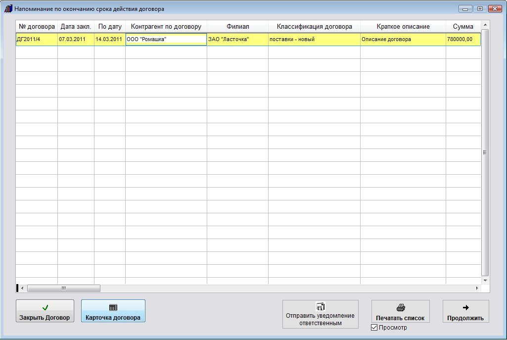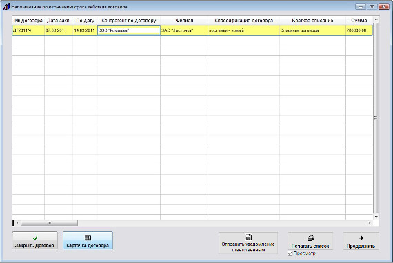 В данном окне оповещения можно закрыть выбранный договор, просмотреть карточки договоров, по которым осуществляется оповещение и при необходимости распечатать список договоров с оповещением.