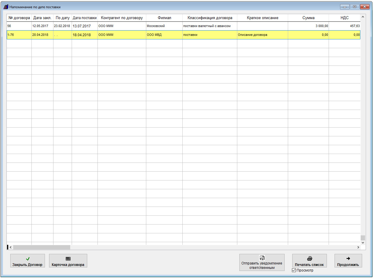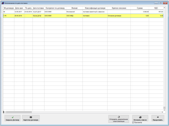 Когда текущая дата станет больше либо равна Дате поставки договора минус количество дней, за которое надо оповещать, договор появится в разделе Оповещения по дате поставки.
