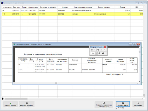 В данном окне оповещения можно просмотреть карточки договоров, по которым осуществляется оповещение и при необходимости распечатать список договоров с оповещением.