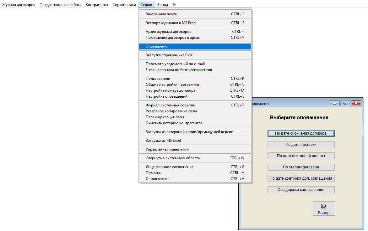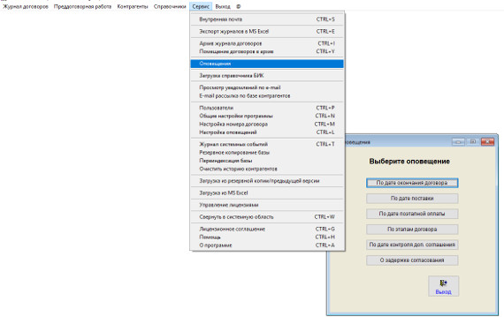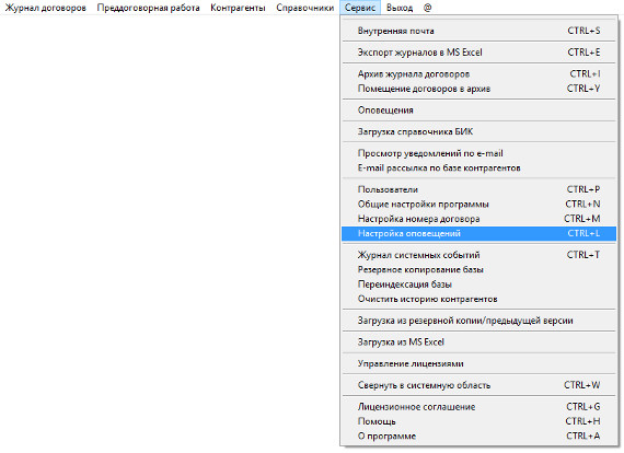 Для настройки параметров оповещения выберите пункт меню "Сервис-Настройка оповещений".