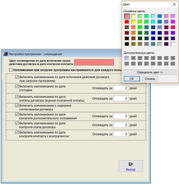 Для выбора цвета истекающих договоров щелкните мышью по красному прямоугольнику, выберите нужный цвет и нажмите ОК.